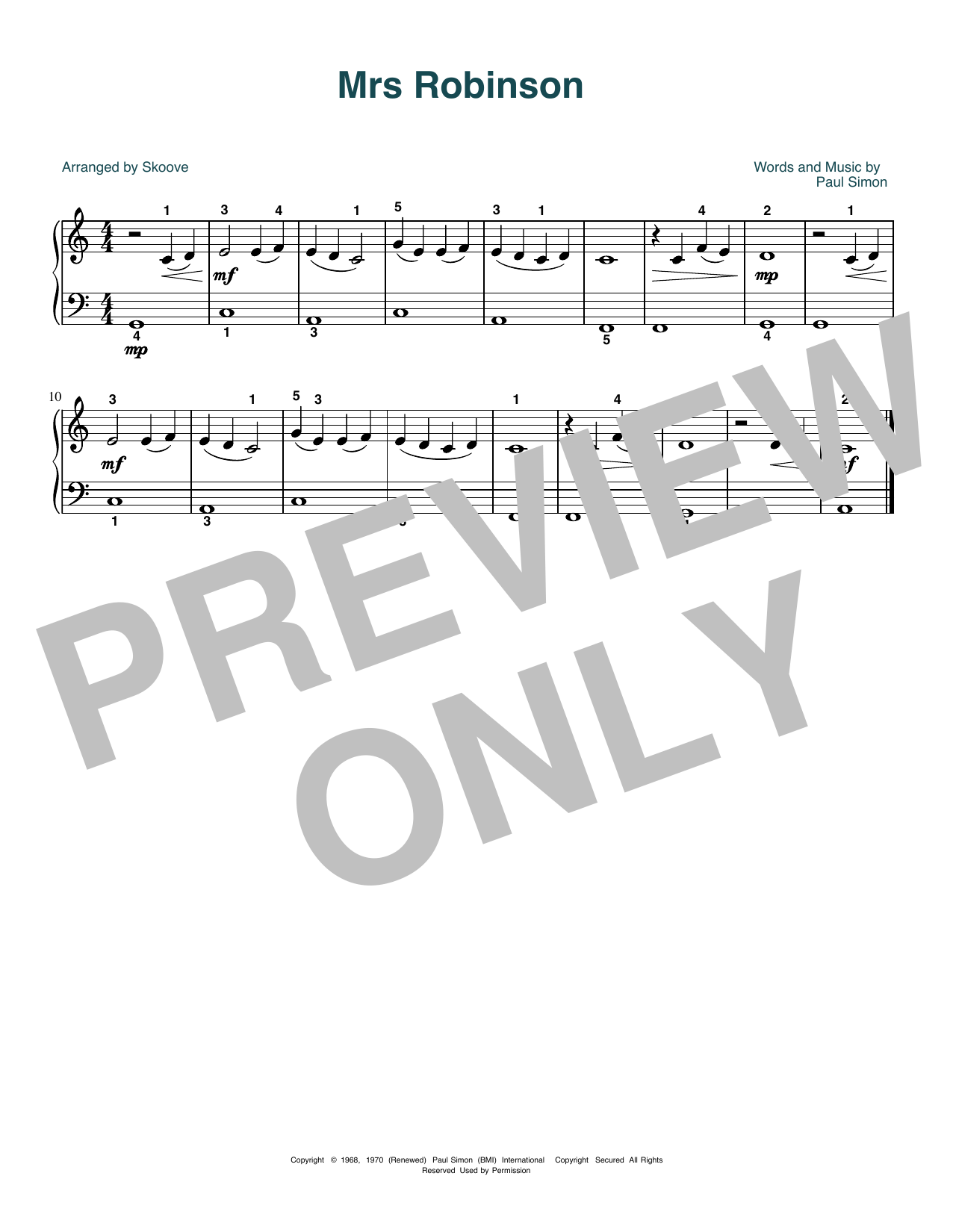 Download or print Simon & Garfunkel Mrs. Robinson (arr. Skoove) sheet music, chords and digital score arranged for Beginner Piano (Abridged). This Pop score includes 1 page(s).
