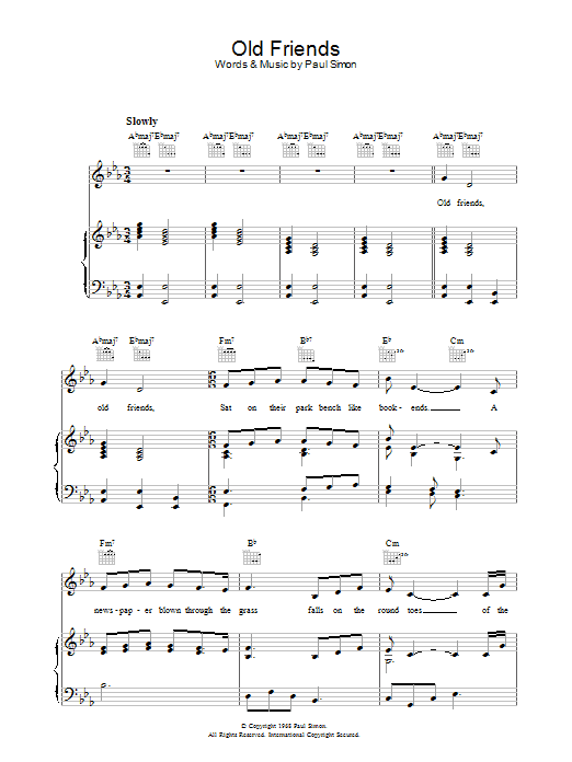 Download or print Simon & Garfunkel Old Friends sheet music, chords and digital score arranged for Piano, Vocal & Guitar Chords. This Folk score includes 4 page(s).