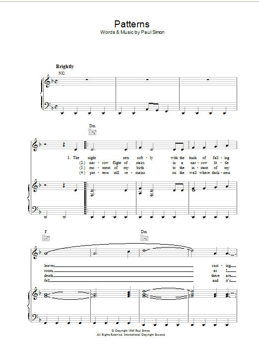 Download or print Simon & Garfunkel Patterns sheet music, chords and digital score arranged for Piano, Vocal & Guitar Chords. This Folk score includes 3 page(s).