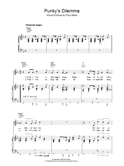 Download or print Simon & Garfunkel Punky's Dilemma sheet music, chords and digital score arranged for Guitar Chords/Lyrics. This Pop score includes 2 page(s).