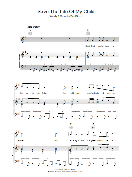 Download or print Simon & Garfunkel Save The Life Of My Child sheet music, chords and digital score arranged for Piano, Vocal & Guitar Chords. This Folk score includes 7 page(s).