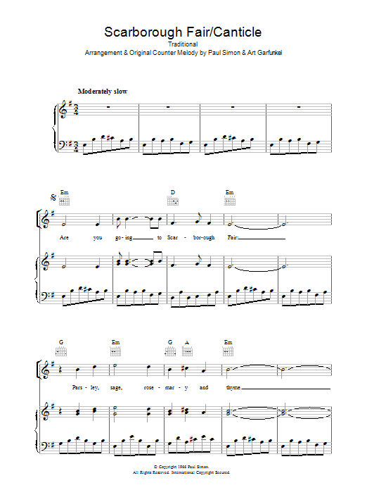 Download or print Simon & Garfunkel Scarborough Fair/Canticle sheet music, chords and digital score arranged for Solo Guitar. This Pop score includes 3 page(s).