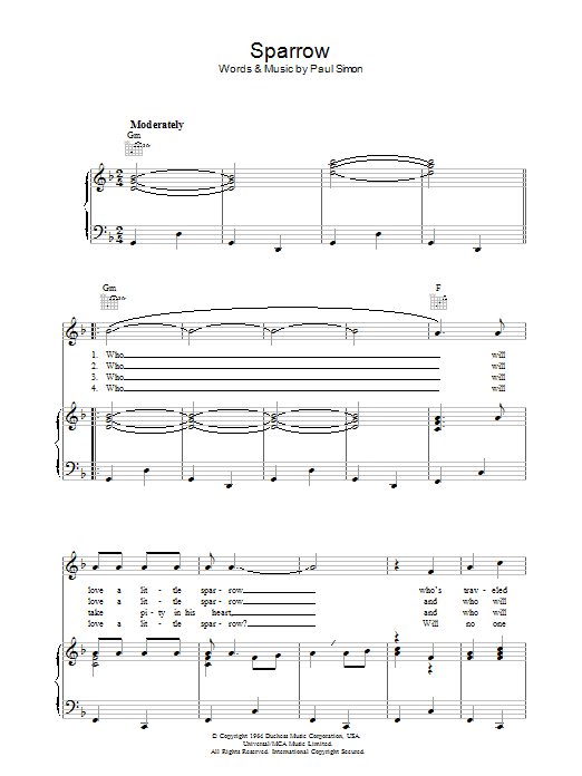 Download or print Simon & Garfunkel Sparrow sheet music, chords and digital score arranged for Piano, Vocal & Guitar Chords. This Folk score includes 3 page(s).