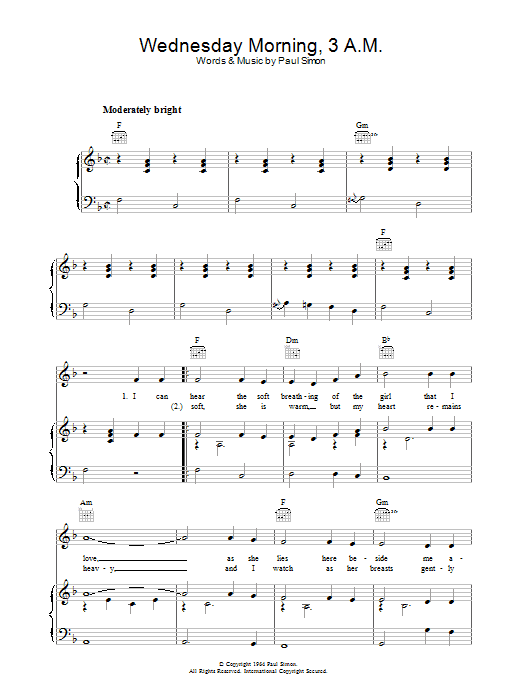 Download or print Simon & Garfunkel Wednesday Morning, 3 A.M. sheet music, chords and digital score arranged for Guitar Chords/Lyrics. This Folk score includes 2 page(s).