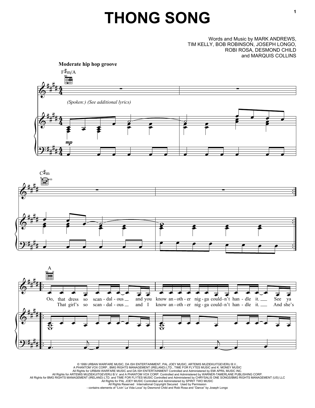 Download or print Sisqo Thong Song sheet music, chords and digital score arranged for Piano, Vocal & Guitar Chords (Right-Hand Melody). This Hip-Hop score includes 7 page(s).