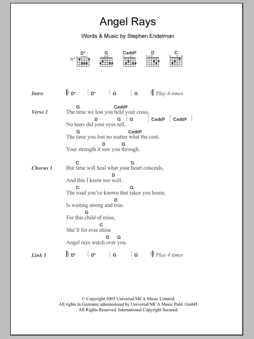 Download or print Sissel Angel Rays sheet music, chords and digital score arranged for Guitar Chords/Lyrics. This Pop score includes 2 page(s).