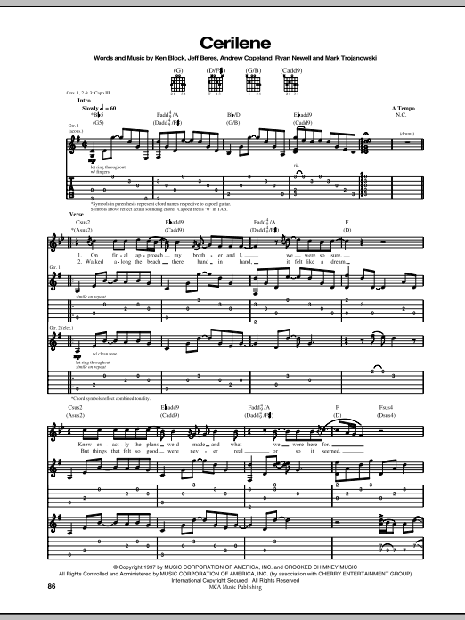Download or print Sister Hazel Cerilene sheet music, chords and digital score arranged for Guitar Tab. This Pop score includes 12 page(s).