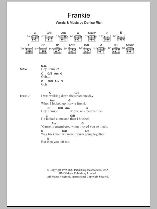 Download or print Sister Sledge Frankie sheet music, chords and digital score arranged for Guitar Chords/Lyrics. This Disco score includes 4 page(s).
