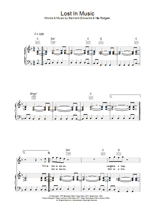 Download or print Sister Sledge Lost In Music sheet music, chords and digital score arranged for Piano Chords/Lyrics. This Disco score includes 2 page(s).