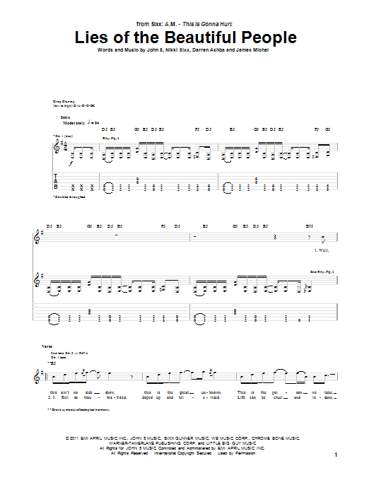 Download or print Sixx A.M. Lies Of The Beautiful People sheet music, chords and digital score arranged for Guitar Tab. This Metal score includes 8 page(s).