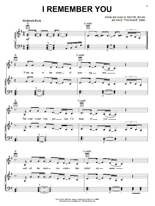 Download or print Skid Row I Remember You sheet music, chords and digital score arranged for Piano, Vocal & Guitar Chords (Right-Hand Melody). This Love score includes 7 page(s).