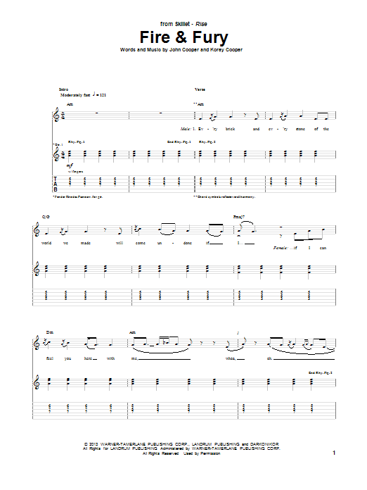 Download or print Skillet Fire & Fury sheet music, chords and digital score arranged for Guitar Tab. This Christian score includes 6 page(s).