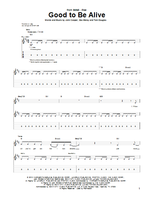 Download or print Skillet Good To Be Alive sheet music, chords and digital score arranged for Guitar Tab. This Christian score includes 9 page(s).