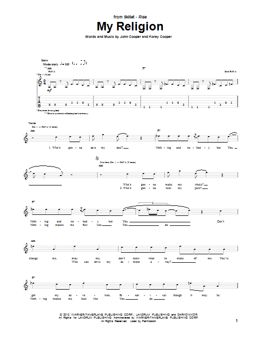 Download or print Skillet My Religion sheet music, chords and digital score arranged for Guitar Tab. This Christian score includes 7 page(s).