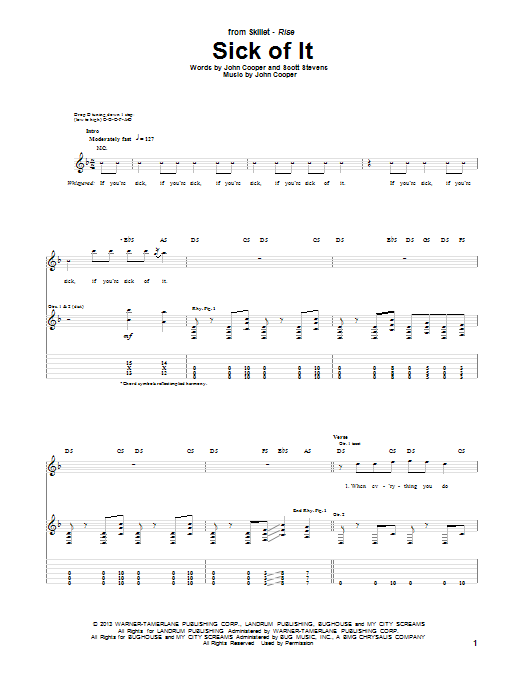 Download or print Skillet Sick Of It sheet music, chords and digital score arranged for Guitar Tab. This Christian score includes 8 page(s).