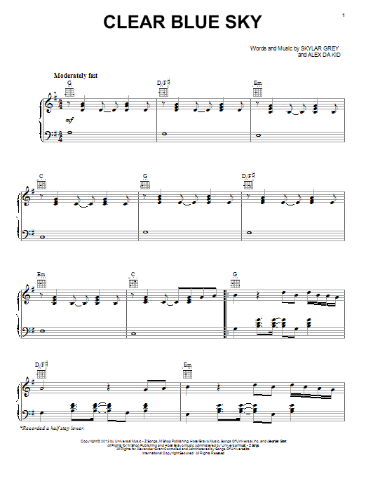 Download or print Skylar Grey Clear Blue Sky sheet music, chords and digital score arranged for Piano, Vocal & Guitar Chords (Right-Hand Melody). This Pop score includes 7 page(s).
