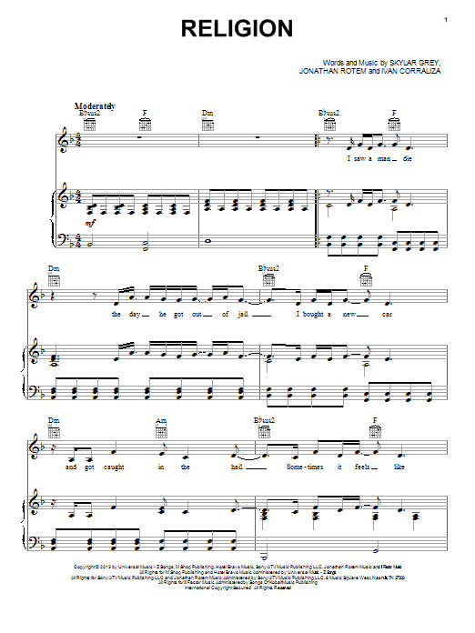 Download or print Skylar Grey Religion sheet music, chords and digital score arranged for Piano, Vocal & Guitar Chords (Right-Hand Melody). This Pop score includes 7 page(s).