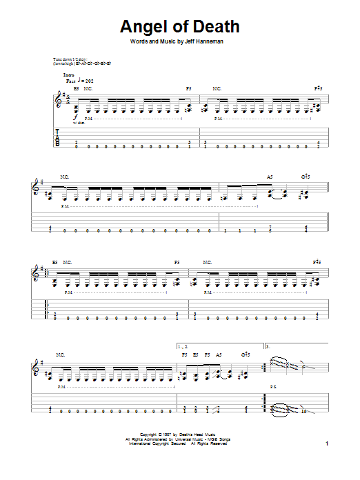 Download or print Slayer Angel Of Death sheet music, chords and digital score arranged for Guitar Tab (Single Guitar). This Metal score includes 15 page(s).
