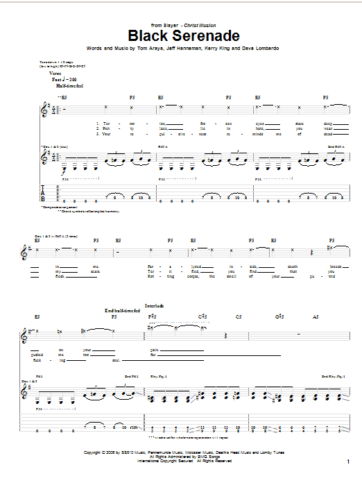 Download or print Slayer Black Serenade sheet music, chords and digital score arranged for Guitar Tab. This Metal score includes 10 page(s).