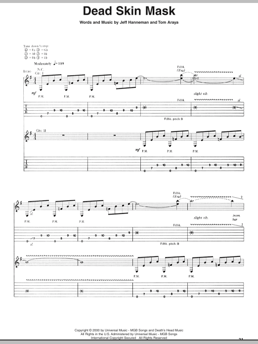 Download or print Slayer Dead Skin Mask sheet music, chords and digital score arranged for Guitar Tab (Single Guitar). This Rock score includes 11 page(s).