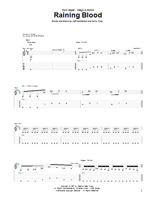 Download or print Slayer Raining Blood sheet music, chords and digital score arranged for Guitar Tab. This Metal score includes 6 page(s).
