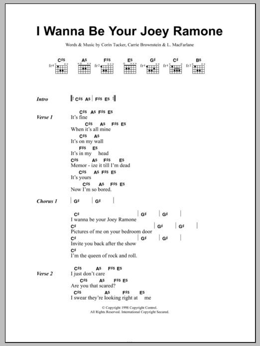 Download or print Sleater-Kinney I Wanna Be Your Joey Ramone sheet music, chords and digital score arranged for Guitar Chords/Lyrics. This Rock score includes 2 page(s).