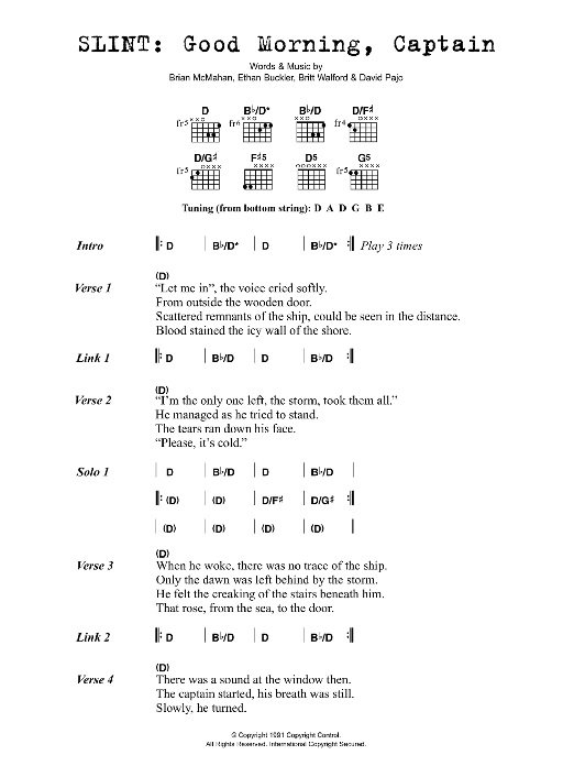 Download or print Slint Good Morning, Captain sheet music, chords and digital score arranged for Guitar Chords/Lyrics. This Rock score includes 2 page(s).