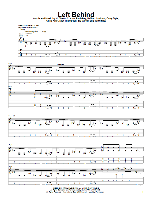 Download or print Slipknot Left Behind sheet music, chords and digital score arranged for Guitar Tab. This Pop score includes 8 page(s).