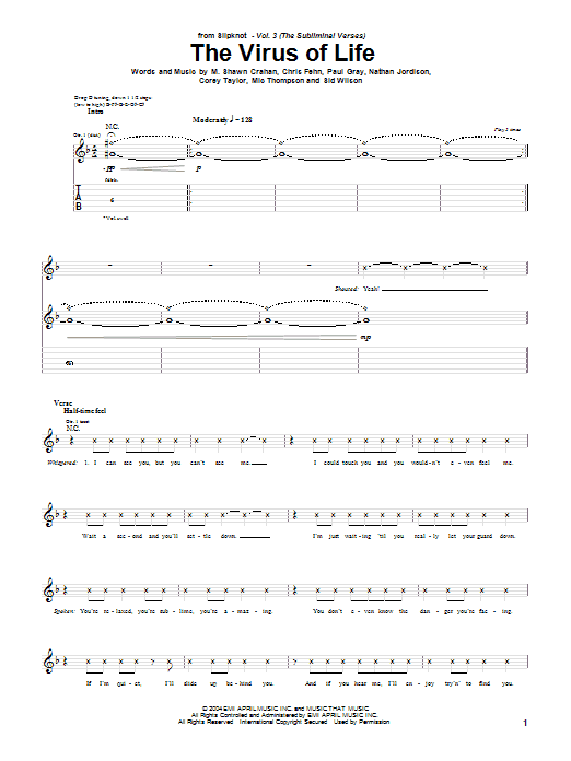 Download or print Slipknot The Virus Of Life sheet music, chords and digital score arranged for Guitar Tab. This Metal score includes 7 page(s).