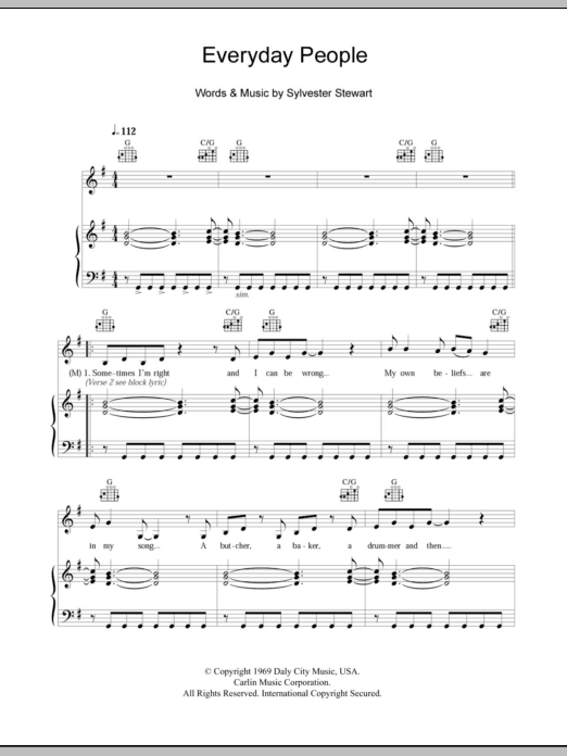 Download or print Sly & The Family Stone Everyday People sheet music, chords and digital score arranged for Guitar Chords/Lyrics. This Funk score includes 2 page(s).