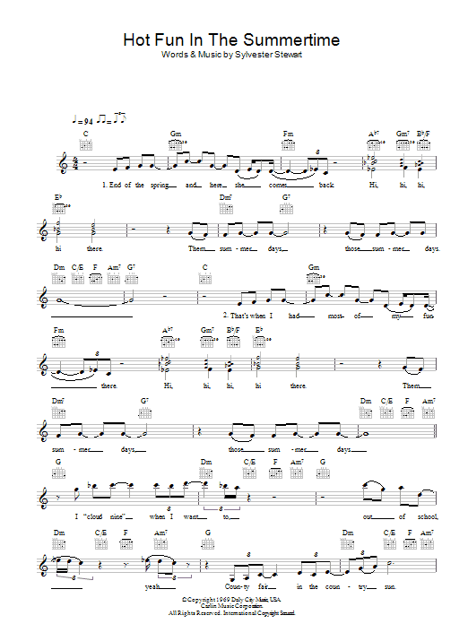 Download or print Sly And The Family Stone Hot Fun In The Summertime sheet music, chords and digital score arranged for Piano, Vocal & Guitar Chords. This Pop score includes 4 page(s).