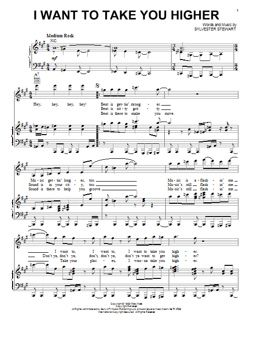 Download or print Sly & The Family Stone I Want To Take You Higher sheet music, chords and digital score arranged for Piano, Vocal & Guitar Chords (Right-Hand Melody). This Pop score includes 9 page(s).