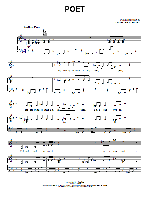 Download or print Sly And The Family Stone Poet sheet music, chords and digital score arranged for Piano, Vocal & Guitar Chords (Right-Hand Melody). This Funk score includes 2 page(s).