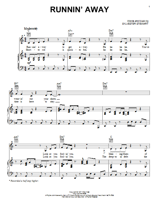 Download or print Sly And The Family Stone Runnin' Away sheet music, chords and digital score arranged for Piano, Vocal & Guitar Chords (Right-Hand Melody). This Funk score includes 3 page(s).