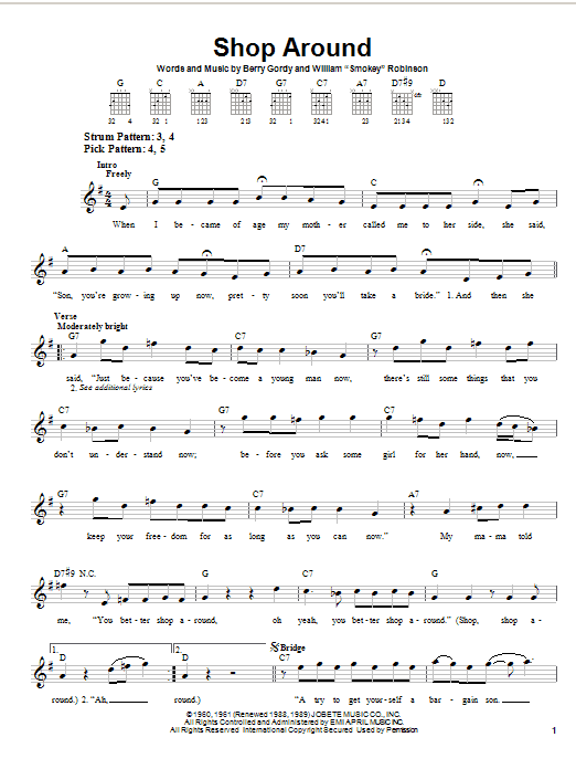 Download or print Smokey Robinson & The Miracles Shop Around sheet music, chords and digital score arranged for Piano, Vocal & Guitar Chords (Right-Hand Melody). This Oldies score includes 4 page(s).