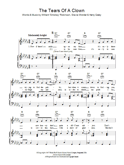 Download or print Smokey Robinson & The Miracles The Tears Of A Clown sheet music, chords and digital score arranged for Piano, Vocal & Guitar Chords (Right-Hand Melody). This Oldies score includes 5 page(s).