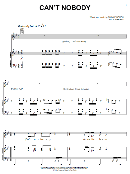 Download or print Smokie Norful Can't Nobody sheet music, chords and digital score arranged for Piano, Vocal & Guitar Chords (Right-Hand Melody). This Christian score includes 8 page(s).