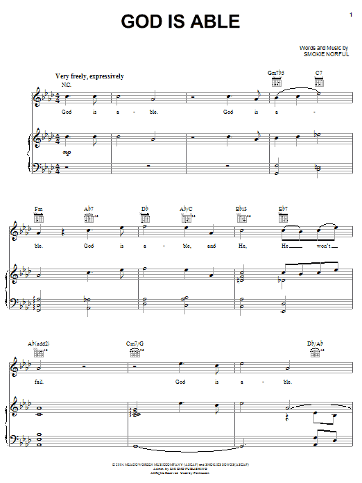Download or print Smokie Norful God Is Able sheet music, chords and digital score arranged for Piano, Vocal & Guitar Chords (Right-Hand Melody). This Christian score includes 9 page(s).