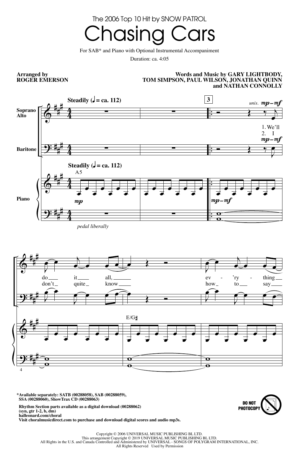 Download or print Snow Patrol Chasing Cars (arr. Roger Emerson) sheet music, chords and digital score arranged for SAB Choir. This Pop score includes 10 page(s).