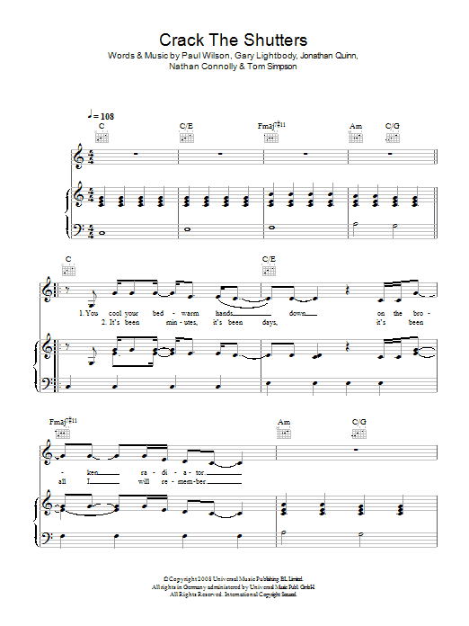 Download or print Snow Patrol Crack The Shutters sheet music, chords and digital score arranged for Piano, Vocal & Guitar Chords. This Rock score includes 4 page(s).