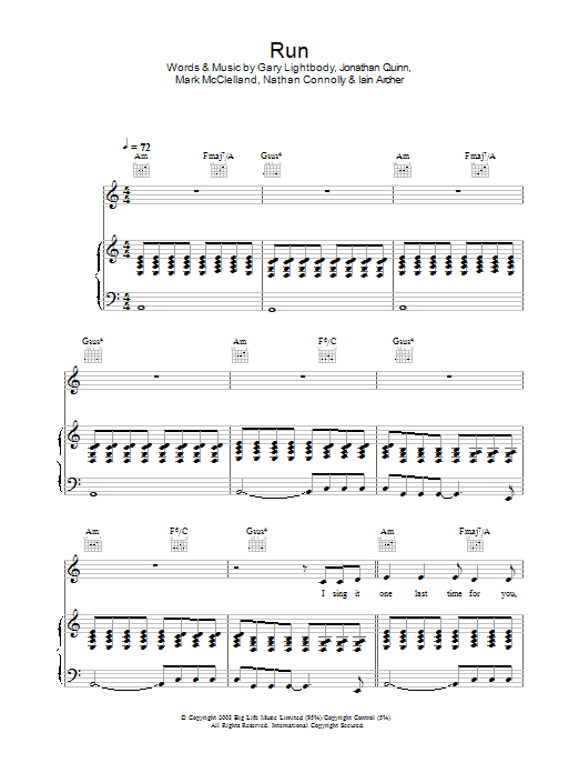 Download or print Snow Patrol Run sheet music, chords and digital score arranged for Lead Sheet / Fake Book. This Alternative score includes 2 page(s).