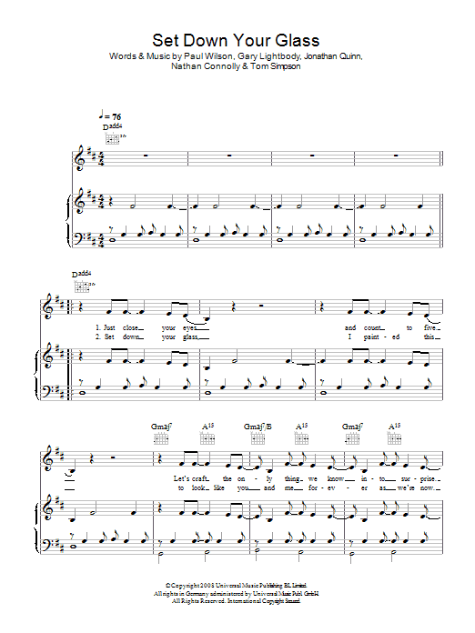 Download or print Snow Patrol Set Down Your Glass sheet music, chords and digital score arranged for Piano, Vocal & Guitar Chords. This Rock score includes 4 page(s).