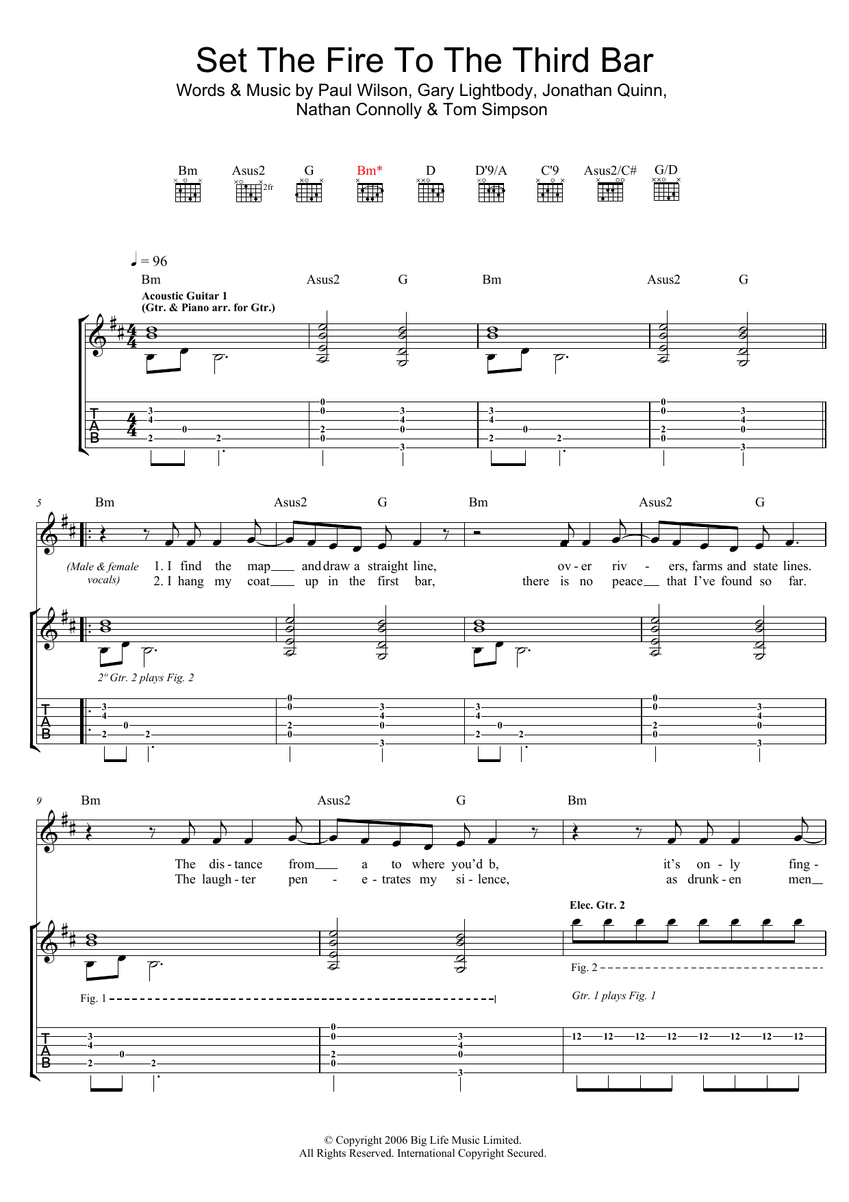 Download or print Snow Patrol Set The Fire To The Third Bar sheet music, chords and digital score arranged for Piano, Vocal & Guitar Chords. This Pop score includes 5 page(s).