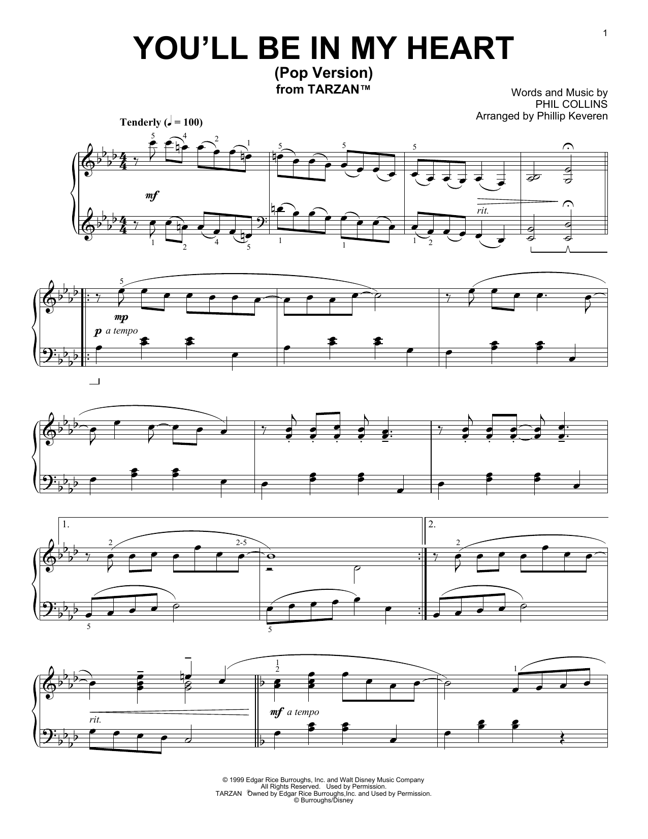 Download or print Phil Collins You'll Be In My Heart [Ragtime version] (from Tarzan) (arr. Phillip Keveren) sheet music, chords and digital score arranged for Piano Solo. This Disney score includes 3 page(s).