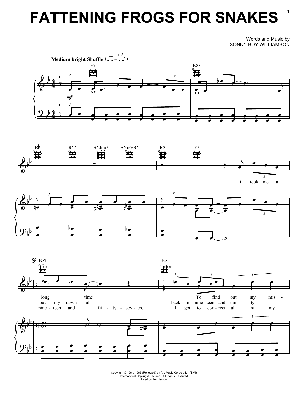 Download or print Sonny Boy Williamson Fattening Frogs For Snakes sheet music, chords and digital score arranged for Piano, Vocal & Guitar Chords (Right-Hand Melody). This Blues score includes 4 page(s).