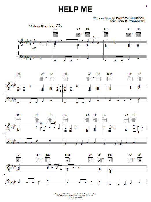 Download or print Sonny Boy Williamson Help Me sheet music, chords and digital score arranged for Piano, Vocal & Guitar Chords (Right-Hand Melody). This Blues score includes 6 page(s).