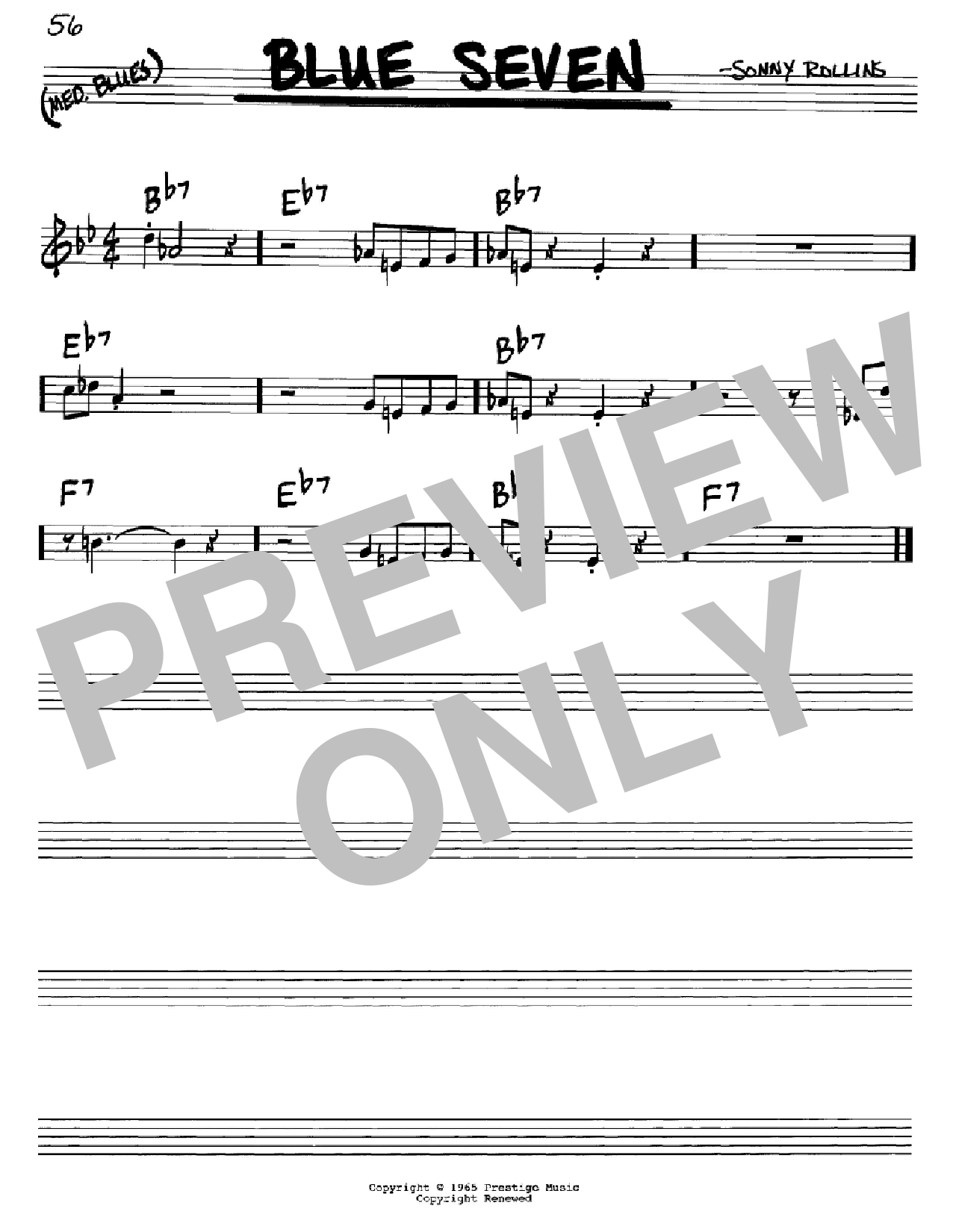 Download or print Sonny Rollins Blue Seven sheet music, chords and digital score arranged for Real Book – Melody & Chords – C Instruments. This Jazz score includes 1 page(s).