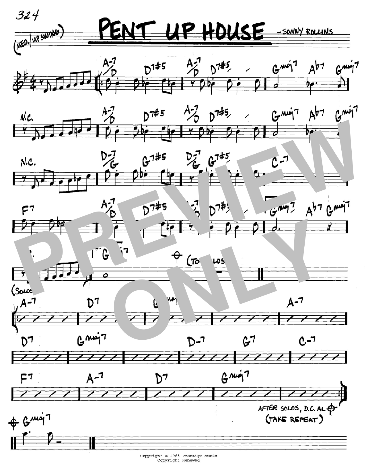 Download or print Sonny Rollins Pent Up House sheet music, chords and digital score arranged for Real Book – Melody & Chords – Bass Clef Instruments. This Jazz score includes 1 page(s).