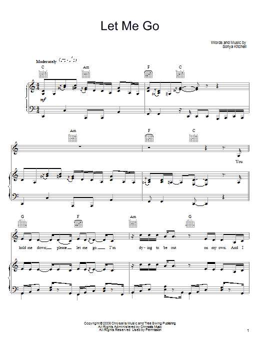Download or print Sonya Kitchell Let Me Go sheet music, chords and digital score arranged for Piano, Vocal & Guitar Chords (Right-Hand Melody). This Folk score includes 8 page(s).
