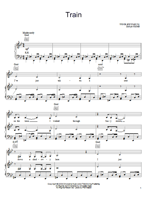 Download or print Sonya Kitchell Train sheet music, chords and digital score arranged for Piano, Vocal & Guitar Chords (Right-Hand Melody). This Folk score includes 10 page(s).